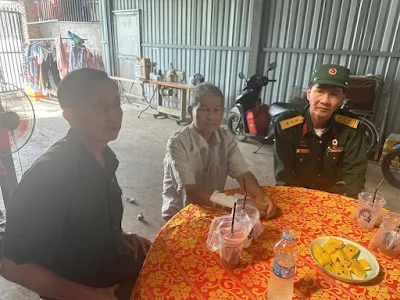 | Thương binh Trần Văn Cầm ngồi ở vị trí trung tâm, thân tình chia sẻ ký ức chiến trường và chuyện đời thường cùng đại diện Hội Doanh nhân CCB trong buổi thăm hỏi đầy nghĩa tình. |